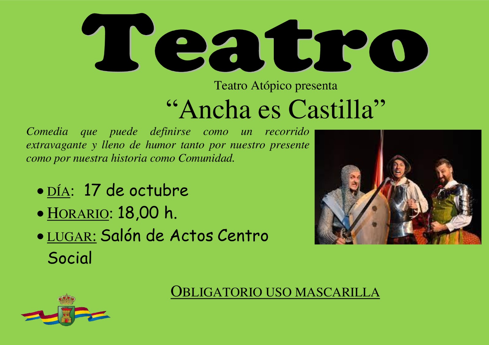 La cómica obra de teatro "Ancha es Castilla" llega al municipio olvegueño. Un recorrido extravagante tanto por el presente y como por la historia de nuestra Comunidad. Un viaje al pasado en el que recordar algunos de los acontecimientos y personajes más representativos de la historia del Reino de Castilla y León entre los siglos IX y XVI.