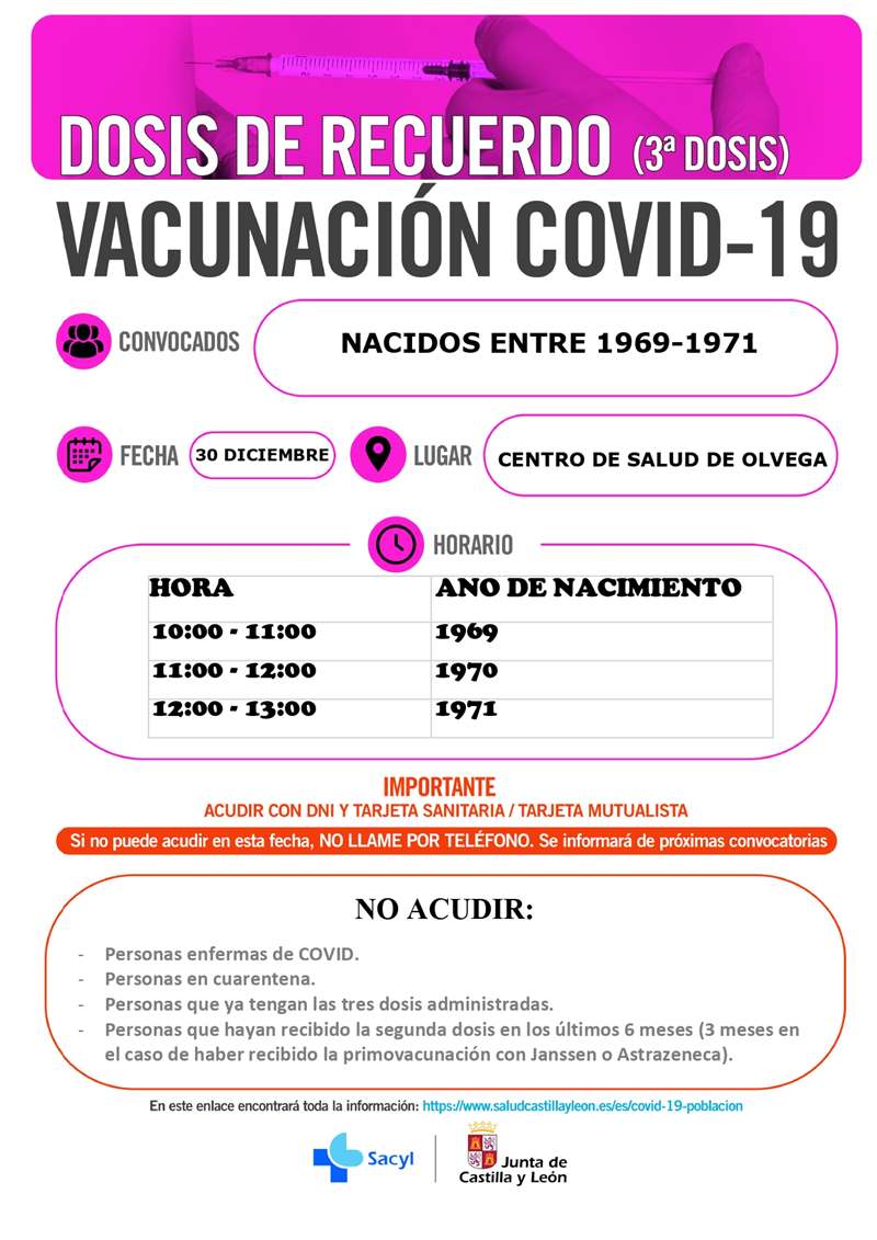 El Ayuntamiento de Ólvega ha informado del calendario de vacunación para personas nacidas entre 1962 y 1971 en el municipio. La administración de estas dosis de refuerzo contra la Covid-19 se realizará en el Centro de Salud los días 27, 29 y 30 de diciembre.
