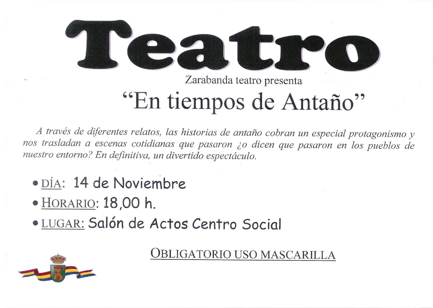 El domingo 14 de noviembre a partir de las 18:00 horas en el salón de actos del Centro Social se representará la obra de teatro "En tiempos de antaño" a cargo de la compañía Zarabanda Teatro.